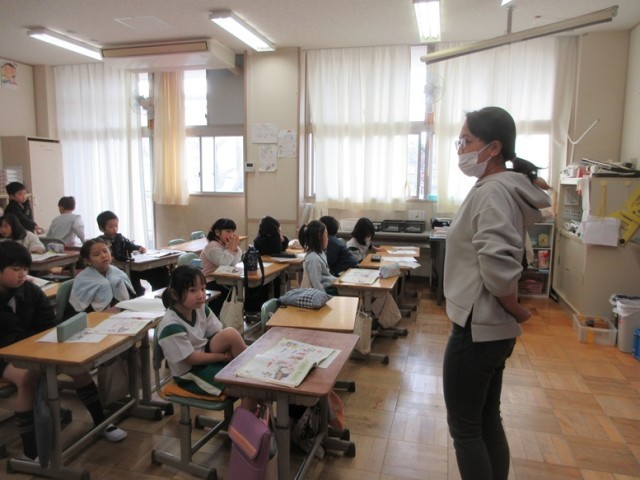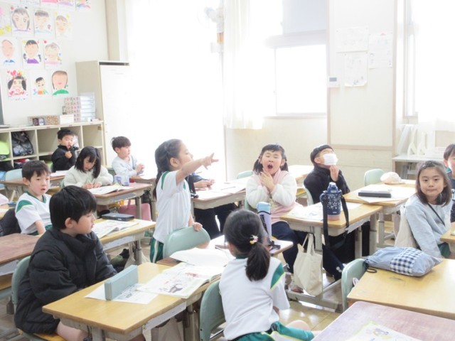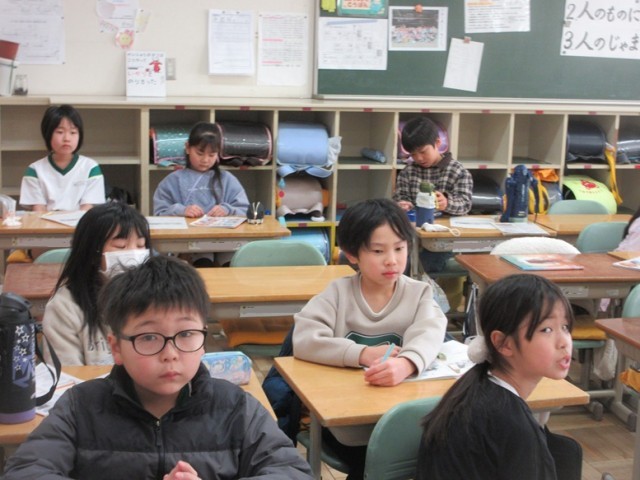 2年1組は、音楽「エンターテイナー」の鑑賞です。主な旋律と低い方の旋律に着目して、どんなふうに感じたかを発表しています。