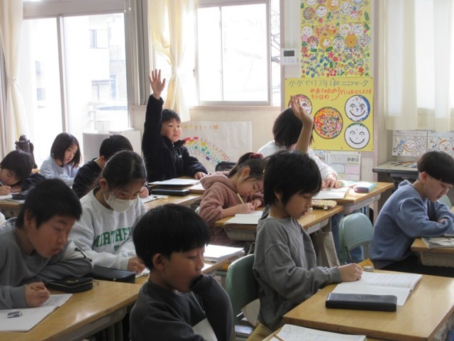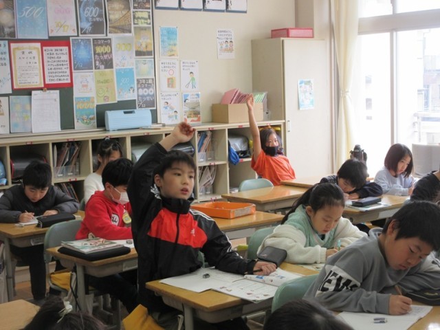 3年1組は、算数で「重さ」の学習をしています。1kgは何gなのか、○gは何kgなのかと単位の換算です。積極的に手をあげて発表しています。