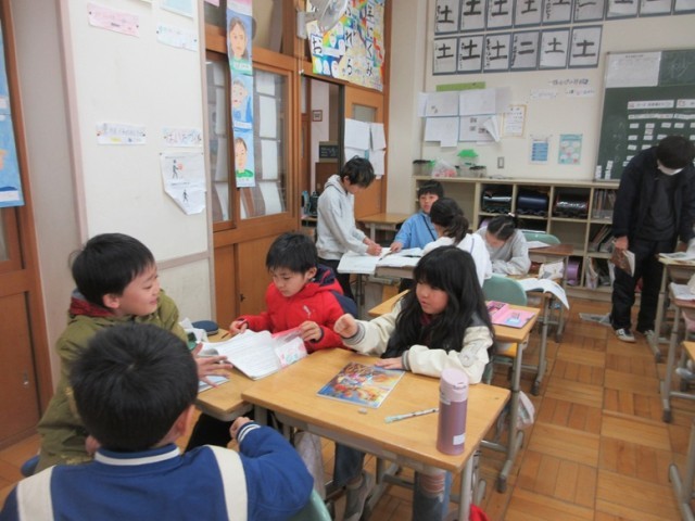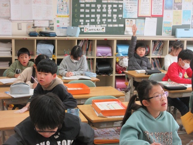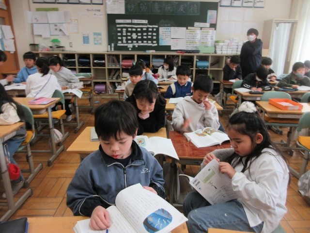 2組は、国語「ゆうせげ村の小さな旅館」の学習です。時間や場所などをキーワードに場面が変わるところを友達と探しています。「きっとここだよ」「ここで変わるよ」と楽しみながら考えていました。