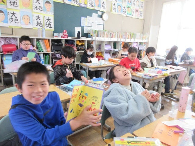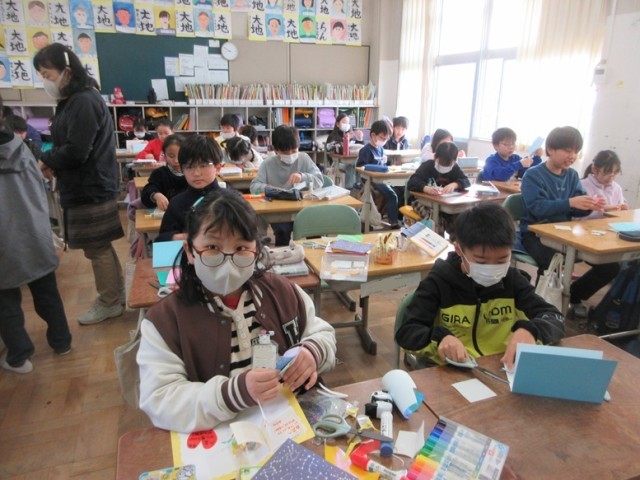 2組は、図工「幸せを運ぶカード」の学習です。「これお母さんに渡すんだ!」「これは妹に渡すよ!」と渡す相手のことを考えながら創造活動が広がっていきます。みんな、工夫がいっぱいあります。