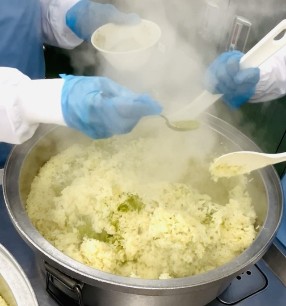 テーマ食品である沼津産のお茶を使った「ぬまづ茶飯」、チンゲンサイを使った「静岡味噌汁」、新メニューの「鶏肉と野菜のマヨネーズ和え」です。