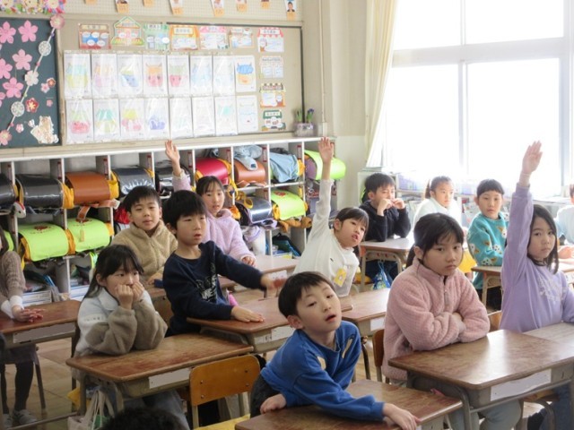 1年1組は、英語の学習で、色と形の組み合わせの学習をしています。「Red Heart」「blue Triangle」など、ALTの先生の出す問題に夢中で答えていました。