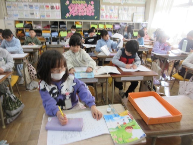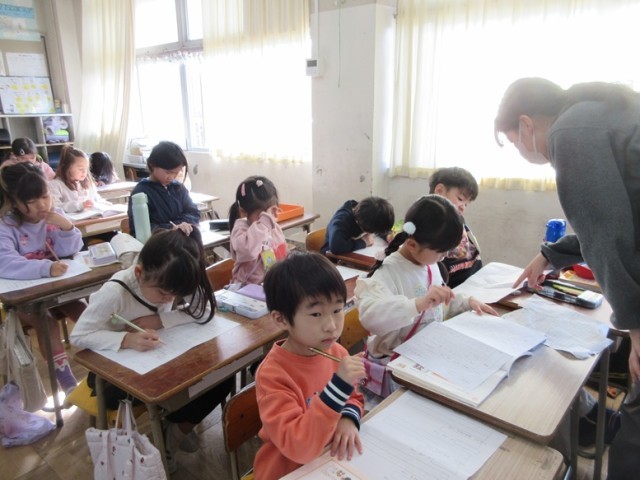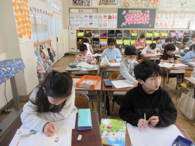 2組は、国語「小学校のことをしょうかいしよう」の学習で、いつ、何をしたのかを詳しくノートに書いています。入学式のことや運動会、砂遊びなど紹介したいことがたくさんありますね!