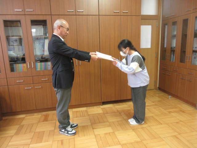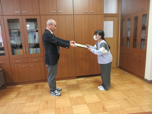 本日の給食の時間に、人権ポスターと県書き初めコンクールの表彰を校長室からリモートで行いました。