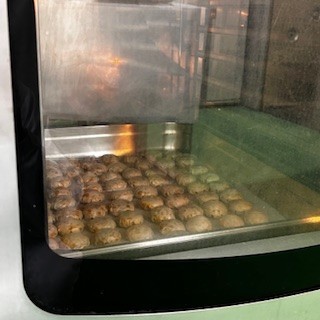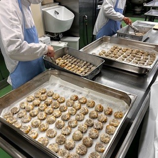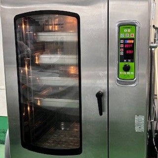 給食室では、大型のオーブン「スチームコンベクションオーブン」で、野沢菜まんじゅうを蒸し焼きにしました。