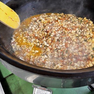 大きなしゃもじのような「スパテラ」と呼ばれる道具で、たくさんの食材を炒め合わせるのは重労働!