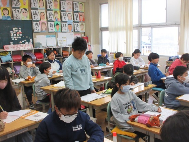 2組は、書写毛筆「近づく春」の練習です。半紙に四文字をバランスよく書いていくのは難しいようでした。