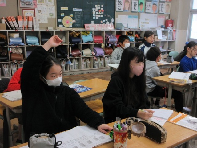 5年1組は、算数「立体」の学習です。円柱、三角柱、四角柱などの特徴について、気づいたこと、似ているところ、違うところなどを発表しています。
