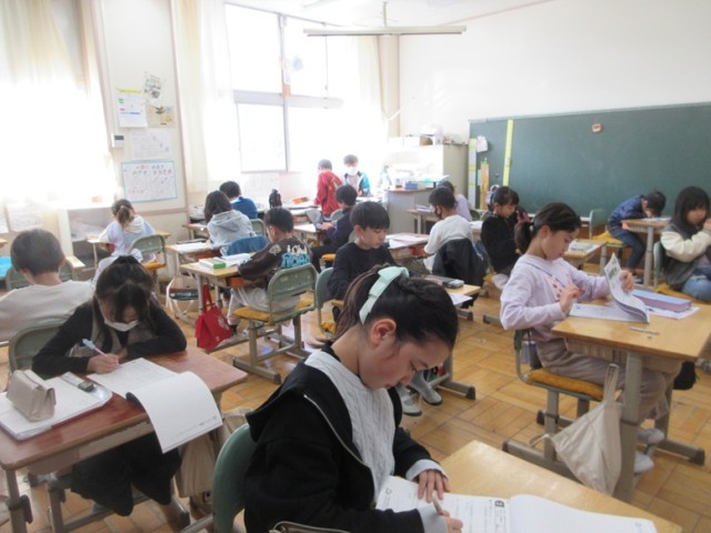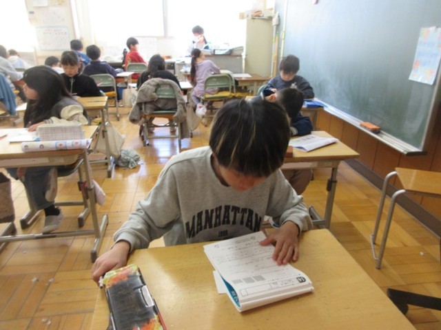 2組は、理科「ものの重さ」のテストです。終わった子は、算数確認ショートテストに取り組んでいます。