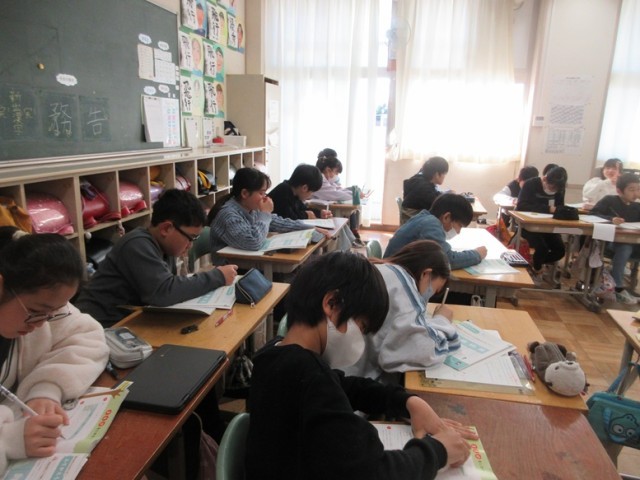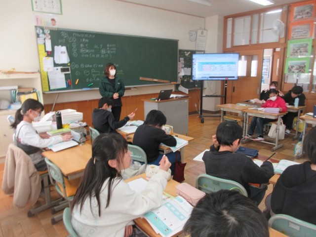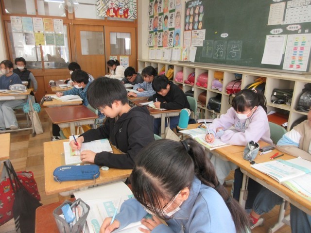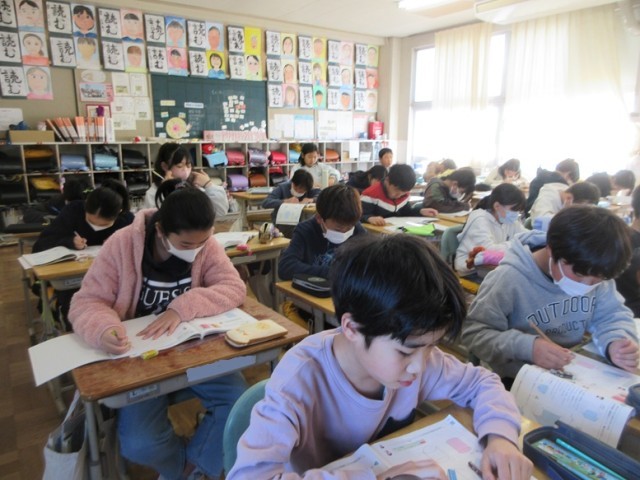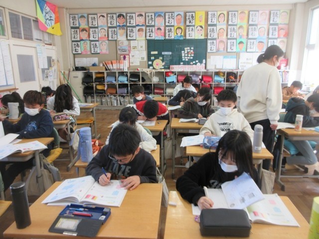 5年1組は、算数「四角柱の見取り図」の学習です。ちょうど4年生も算数で見取り図の学習をしています。1年前のことを思い出しながら応用できたかな?