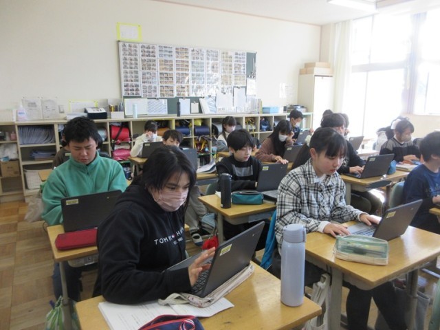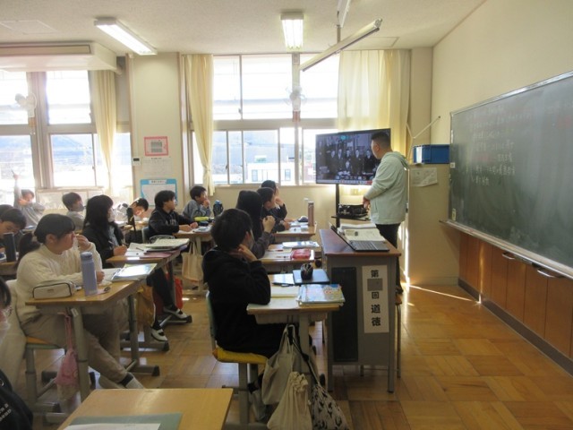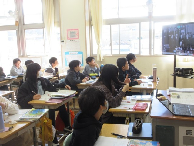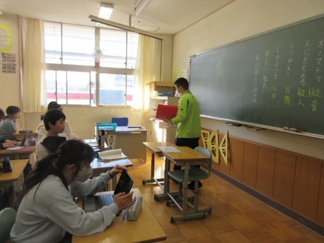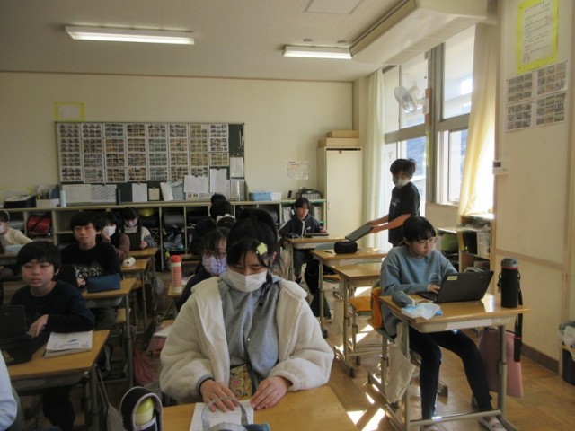 3組は、社会科「戦後の復興」の学習です。国際連合発足の動画を見ながら、当時の日本がどのような状況だったのかを考えています。