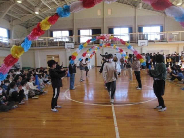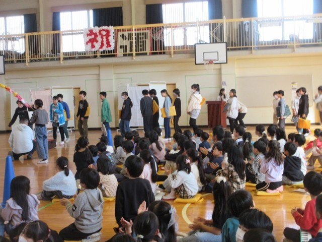 今日は、6年生を送る会が開催されました。これまで5年生を中心に、企画・準備、練習を重ねてきた下級生からの贈り物です。時間になり、6年生がアーチをくぐりながら、ちょっぴり照れくさそうに花道を歩いてきます。アーチの前では1人1人考えたポーズで下級生たちをわかせています。