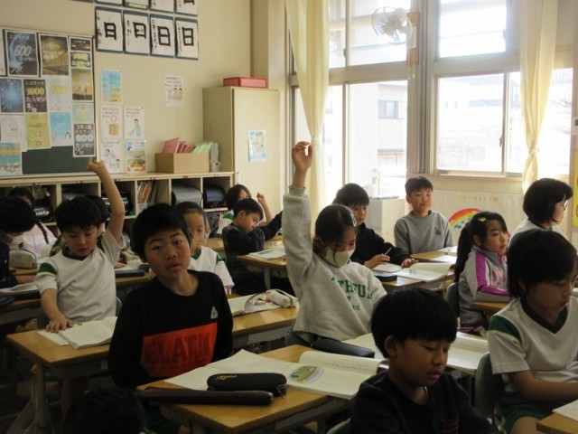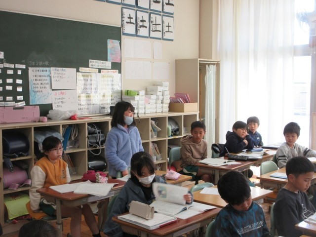 3年1組は、国語の物語文の学習です。先生が読み聞かせをした後、どんなお話だったのかを発表しています。