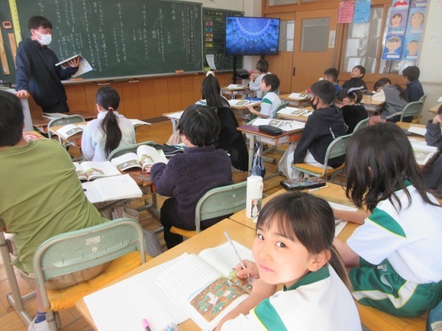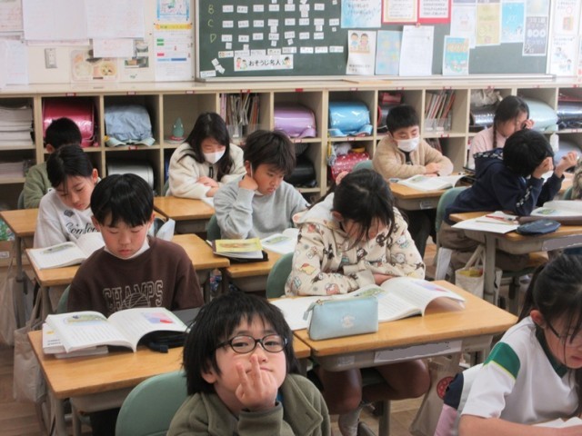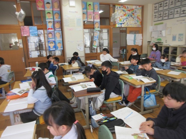 2組は、国語「ゆうすげ村の小さな旅館」の学習です。いよいよ物語のクライマックスです。主人公の正体が分かる表現のしかけをみんなで考えています。
