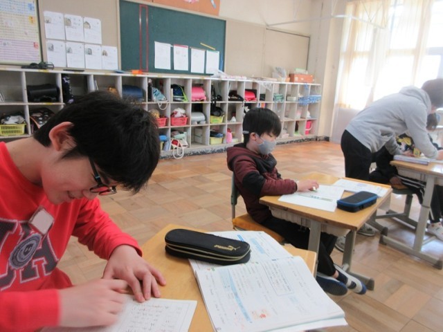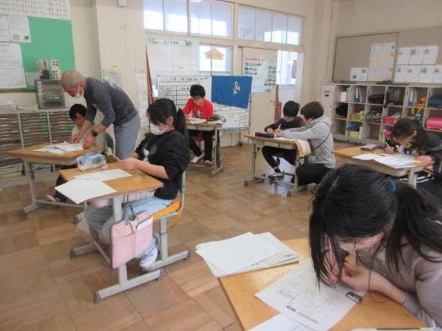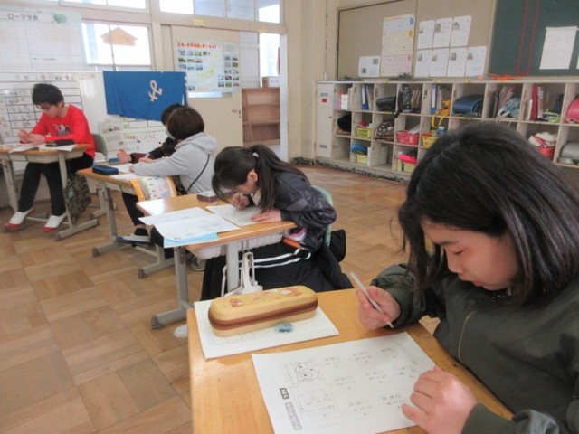 2組も算数です。□を使った計算、グラフの問題、ともなって変わる2つの量などの問題に取り組んでいます。みんな、じっくりと落ち着いて問題に向かっています。