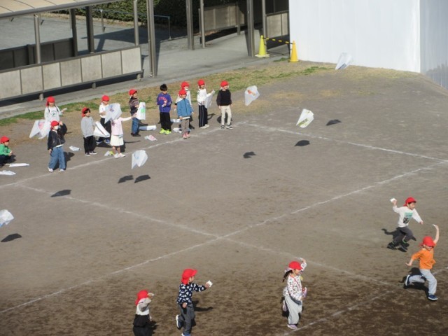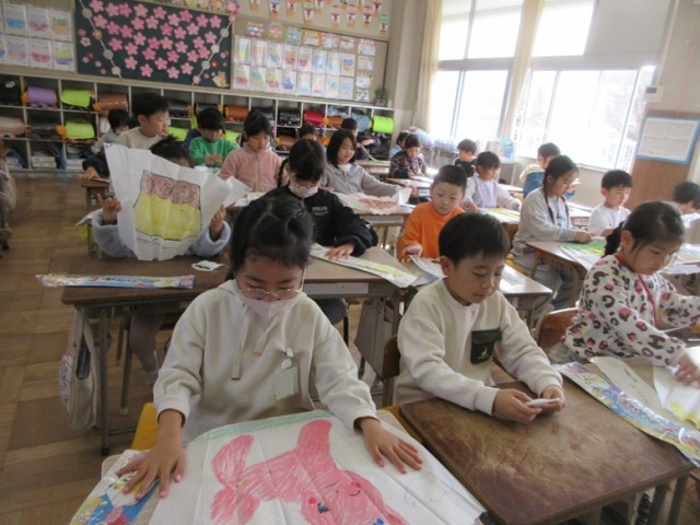 1年1組は、図工で「ぐにゃぐにゃだこ」を飛ばす準備です。なかなか外で飛ばすことができずにいましたが、ようやく今日、外で飛ばすことができました。グランドが狭いことと、風がなかったことで高く上がるまではいきませんでしたが、みんな、楽しくたこあげすることができました。