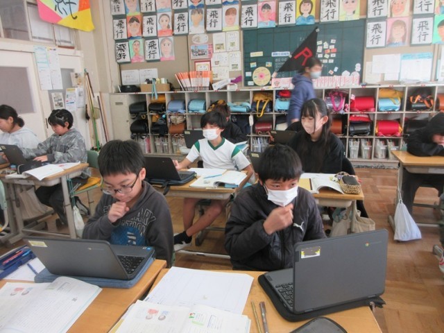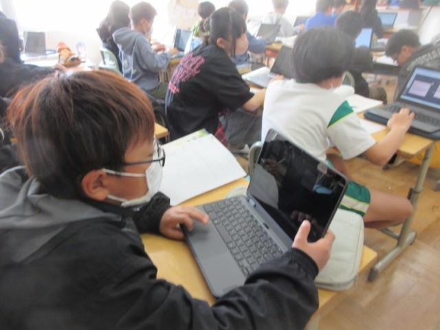 5年生は1,2組とも国語「資料から意見文を書こう」の学習です。1組では、Chromebookを使って「食品ロス」について調べ、まとめています。