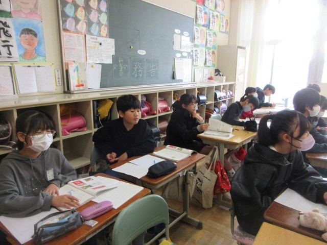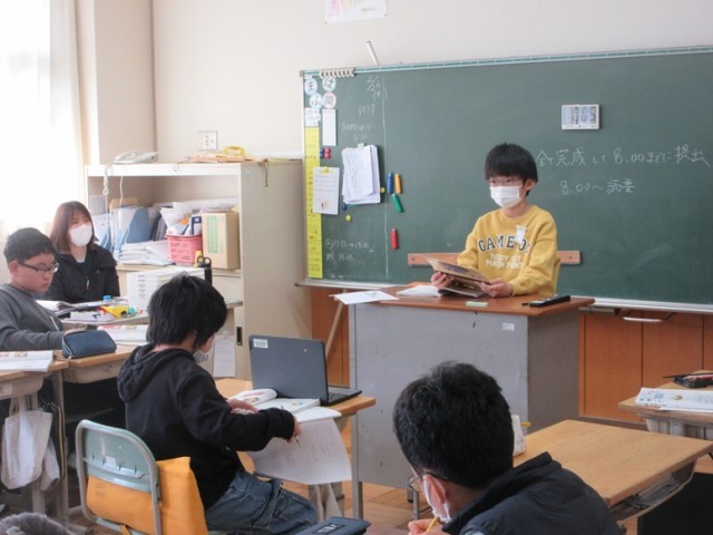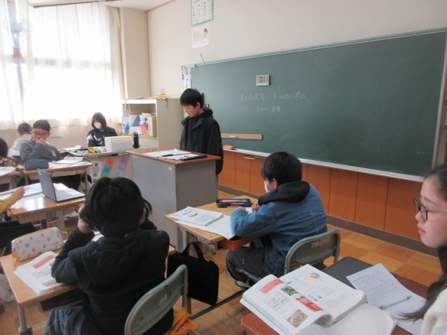 2組は、それぞれの意見を前に出て発表していました。聞いている友達は、発表の評価をして一言コメントをプリントに書いています。