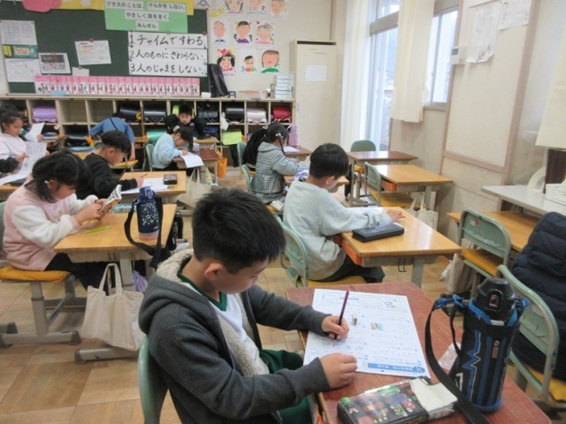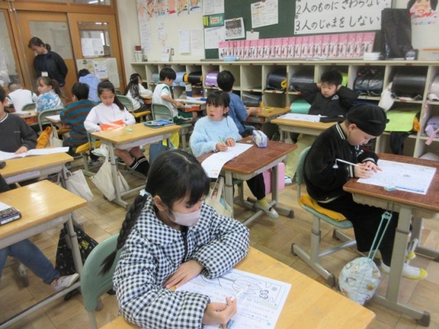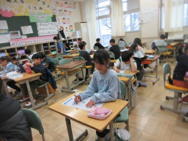 2年1組は、国語「学年末のまとめテスト」です。これまで習った漢字も多く出ていましたね。しっかり書くことはできたかな?