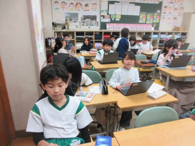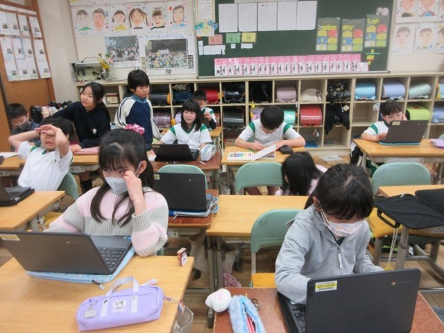 2組は、国語「お手紙」の学習です。2つの絵を見てがまくんとかえるくんの気持ちの変化が分かるところを見つけて、ロイロノートで共有しています。
