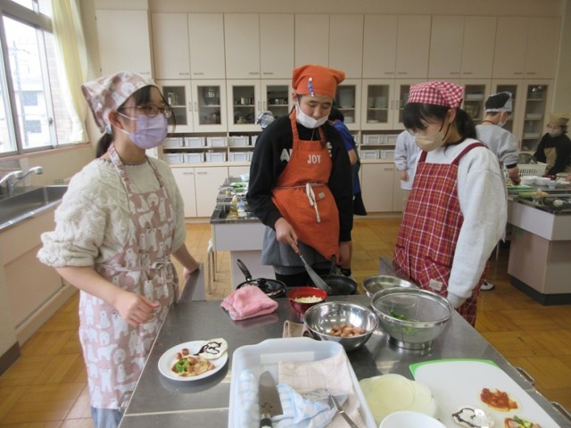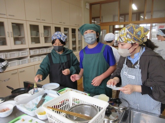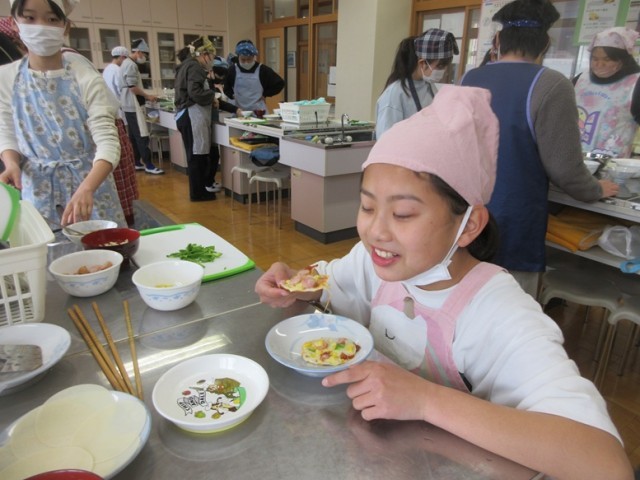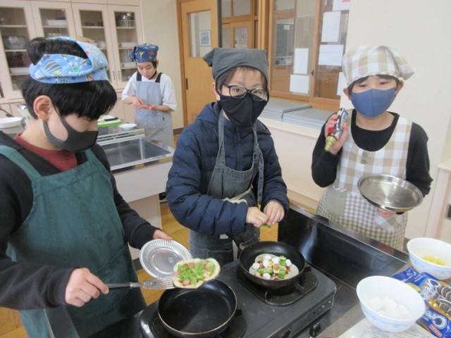 校長室に、6年2組の子が調理実習で作った餃子の皮ピザを持ってきてくれました。一口サイズで、味もしっかりピザでした。とってもおいしかったです。家庭科室に行くと、みんな、それぞれが工夫をこらして餃子の皮を使ったピザやスイーツを作っていました。中には、ピザのソースとマシュマロ、チョコレートのミックスを作っている男の子もいました。どんな味がするんだろう…。6年生、1日1日をクラスの仲間と有意義に過ごしています。