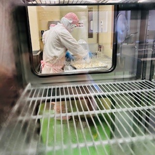 生のお肉やお魚を扱う部屋で、ピンク色のエプロンを着けて、一つ一つ丁寧にデンプンをまぶし、形を整えて鉄板に並べていきます。