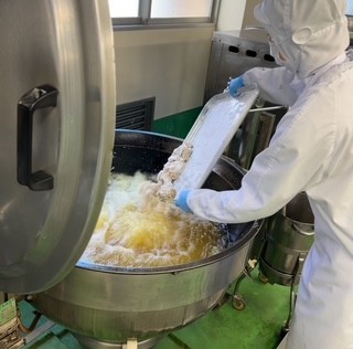 調理用の白いエプロンを着けて、油が跳ねて火傷をしないよう、慎重に、素早く釜へ入れていきます。