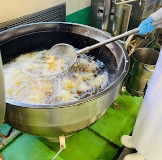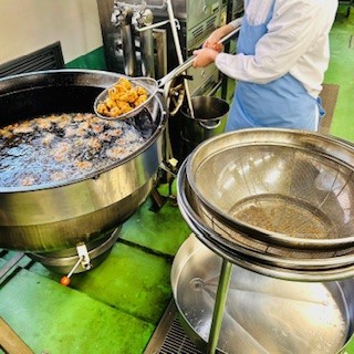 確認ができたら、クラスに分けるようの青いエプロンをつけて、釜から唐揚げを取り出します。
