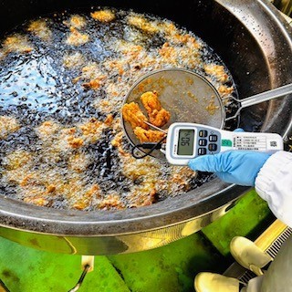 調理場では、揚げ油を温めて準備完了です。油の温度は170度。