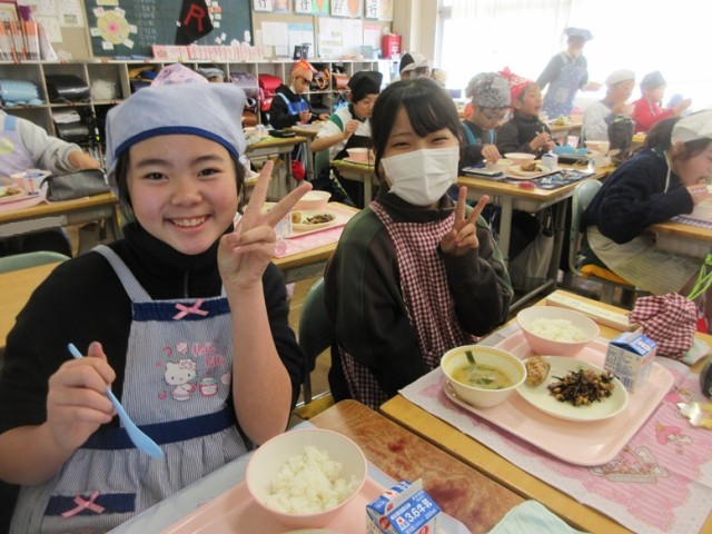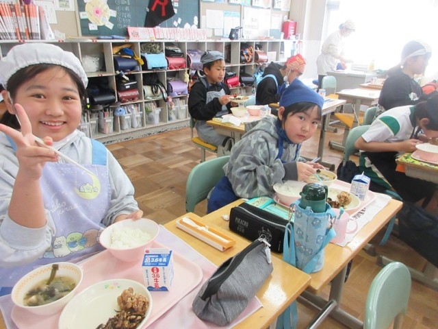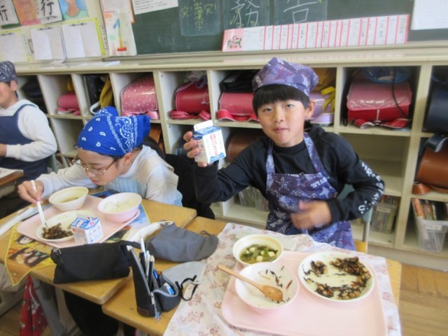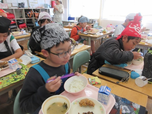 今日の献立は、鶏肉の唐揚げ、ひじきと大豆の煮物、ご飯、豆腐とたまねぎの味噌汁、牛乳です。昼の放送では、毎回、たくさんのご飯が残されているというクイズが出ました。5年生は今、ちょうど食品ロスについても学習しているため、なるべく食べ残しがないようにという意識が強いようです。今日も笑顔で食べています。