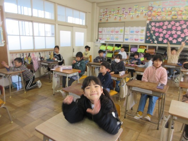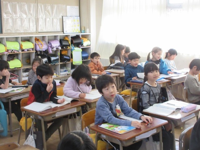 1年1組は、国語「スイミー」のテストです。みんな、テストを配られるのを待っています。スイミーの気持ちや場面の様子、漢字などを考えて答えることができたかな?