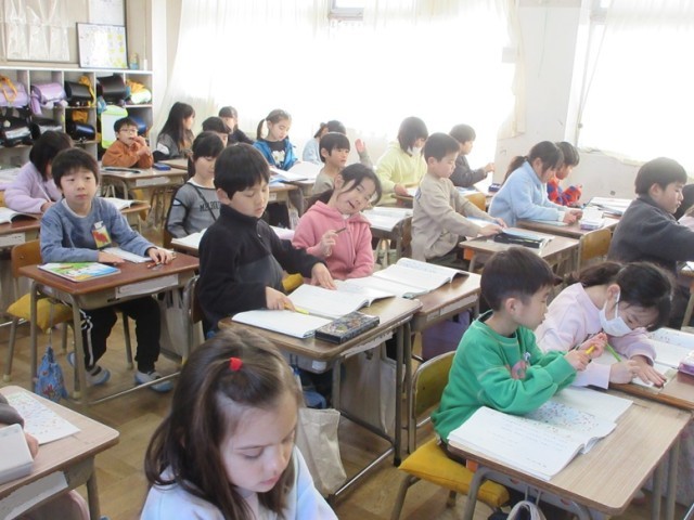 2組は、国語「スイミー」の学習です。前回は、「いろんな生き物に会えてよかった」というところまで。さて、今日はどうなっていくのかな?みんなで丸読みしていきます。