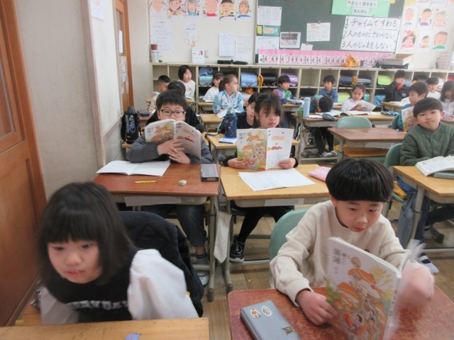 2年1組は、国語「お手紙」の学習です。まずはみんなで丸読みをしていきます。がまくんとかえるくんの行動や気持ちなどを考えていきます。