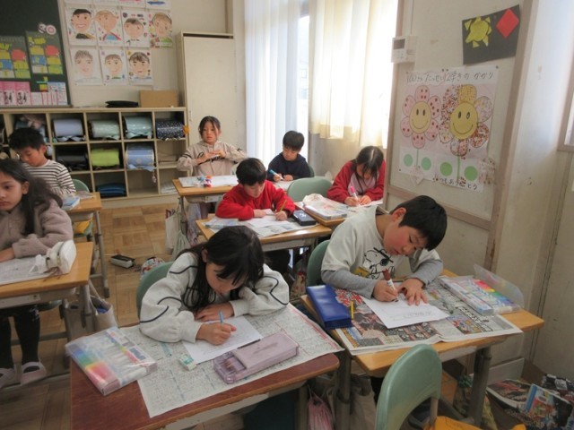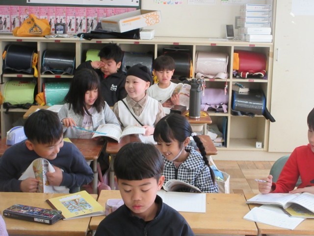 2組は、図工ですが、「ちょっと秘密なのでホームページには書かないで」と子供たち。秘密にしておきますね。この後、図工の作品バッグに絵を描きました。