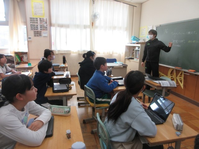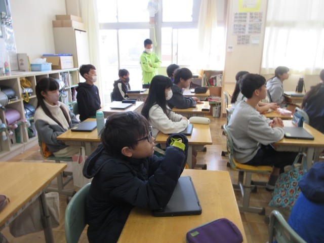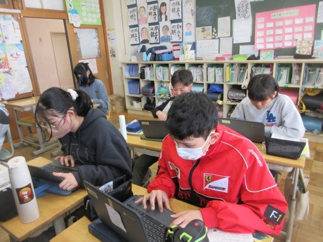 6年1組は、キャリアパスポートをまとめています。低学年の頃の写真もあり、「かわいい~!」と幼かった頃の友達を見て微笑んでいました。大きく成長しましたね!