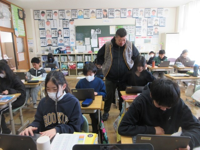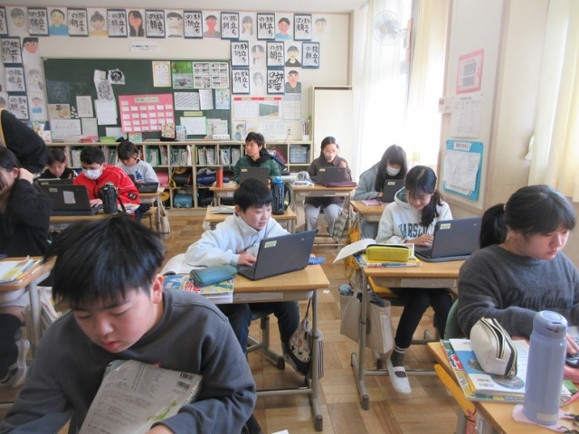 2組は、メディアリテラシーの学習です。AIや著作権について、情報主任の先生の授業を受けています。学んだことを実践に結びつけ、誰も傷つかないメディア使用をしていきたいものですね。