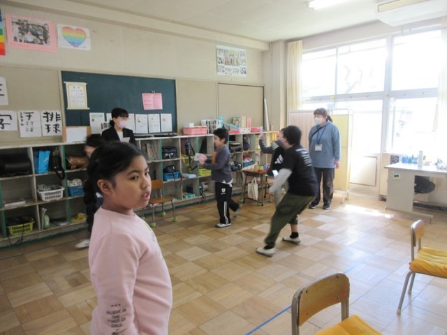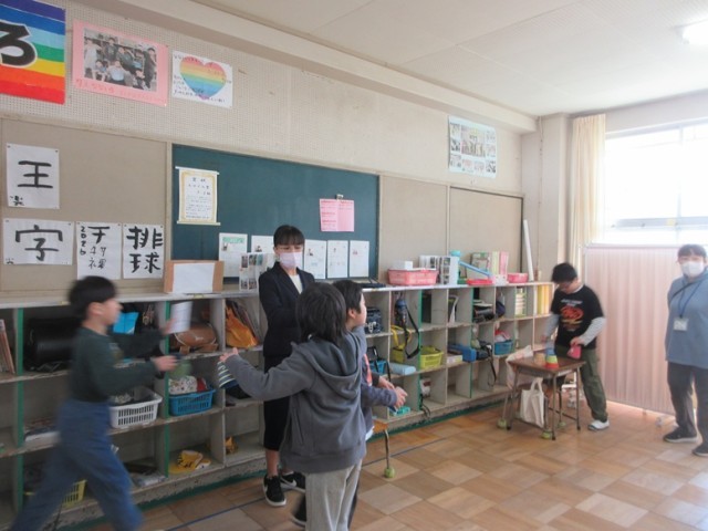 2組は、英語「アルファベット」の学習です。アルファベットカードを引いて、紙コップのキャラクターに合わせていきます。教室中をを使って楽しく学習しています。