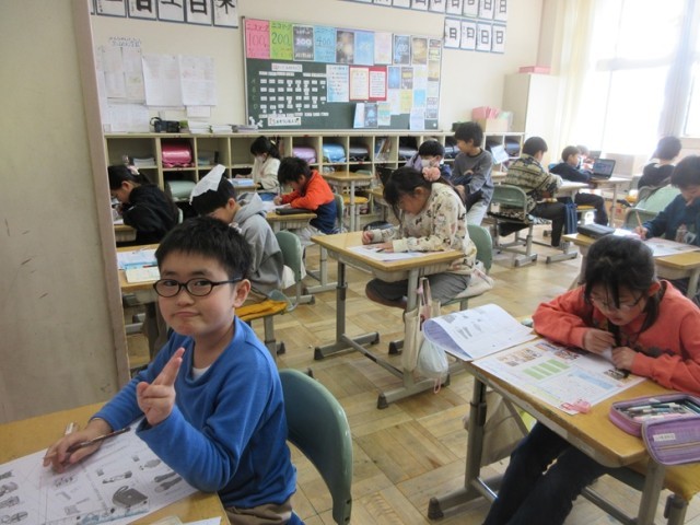3年1組は、社会科「店ではたらく人」「市の様子」のテストです。1年間のまとめです。しっかりと答えられたかな?