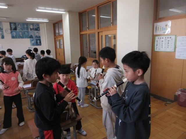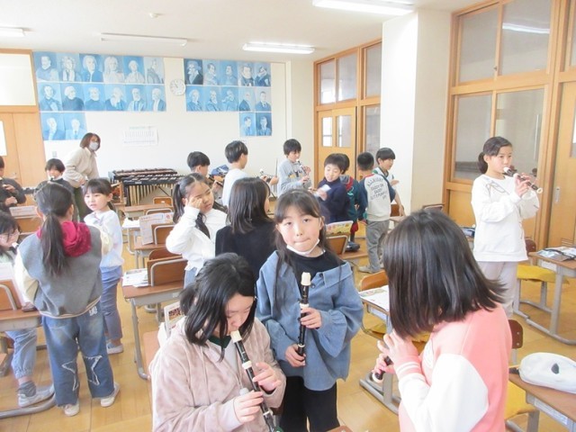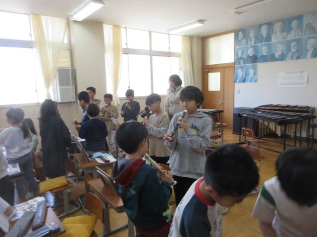 2組は、音楽「旋律づくり」の学習です。「ラドレを使ってどんな音楽ができるかな」という学習課題に向かってグループで協力して旋律づくりに取り組んでいきます。