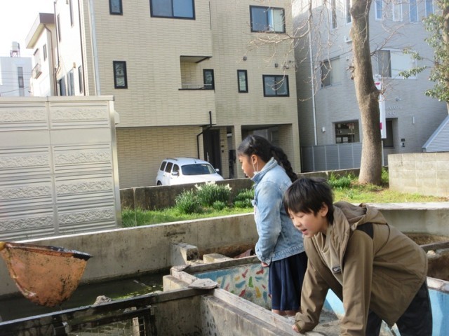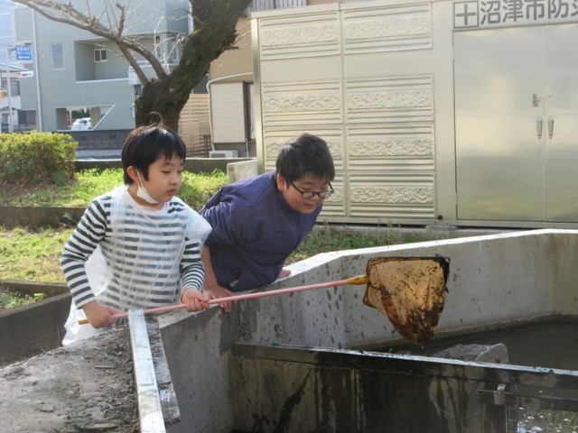 2組は、取り壊される予定の池からドジョウを救出するんだと、網を持ってドジョウを探していました。泥があってなかなか見つけられませんが、一生懸命探していました。ヤゴなども見つかりました。