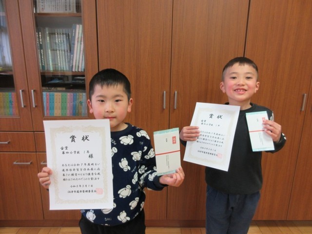 今日、給食の時間にリモートで「明るい選挙啓発習字」の表彰を行いました。金賞に輝いた1年生2人に、代表で校長先生から賞状が手渡されました。そのほかに、銀賞、銅賞に輝いた子たちの名前が呼ばれ、各クラスで担任の先生から賞状を手渡されました。今回のコンクールでは、四小からの作品が多く表彰されました。これからも書写に前向きに取り組んでいきましょう!