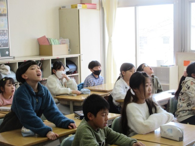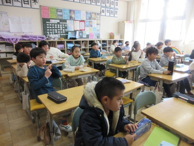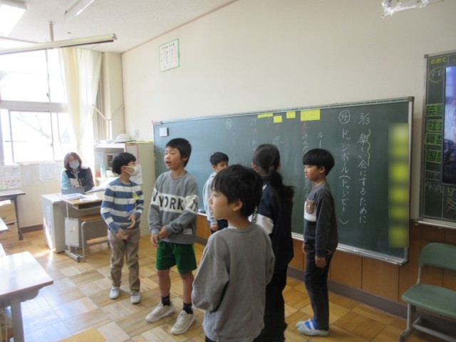 3年1組は、お楽しみ会の話し合いです。ドッジボール(ドッジビー)をやることは決まったようですが、そのルールを話し合っていました。決まったのは、「わざと当たらない」「みんなが触れる」そして、「投げる前に思い出を言ってから投げる」というおもしろいルールでした。楽しくできるといいですね。