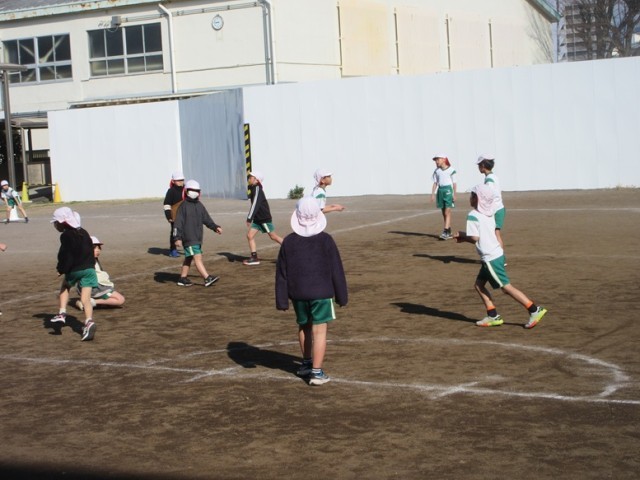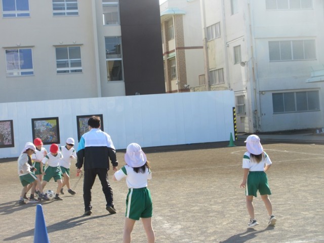 2組は、体育「サッカー」です。制限のあるグラウンドをいっぱいに使ってサッカーをしています。先生も入ってとても白熱しています。