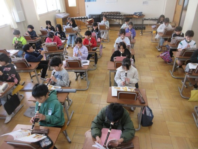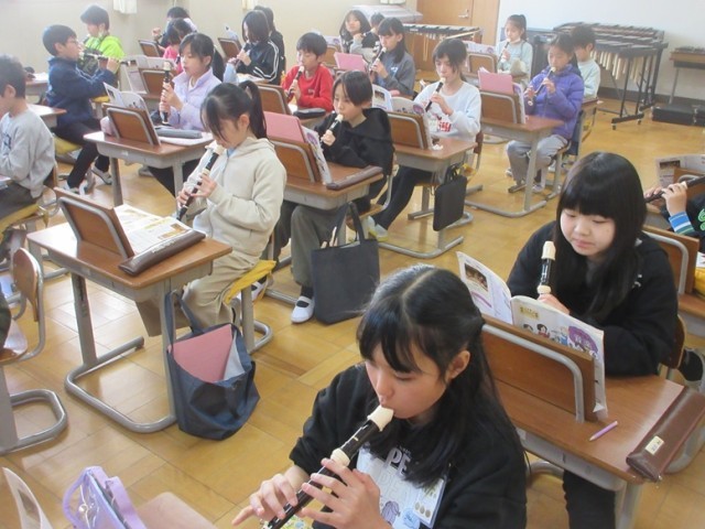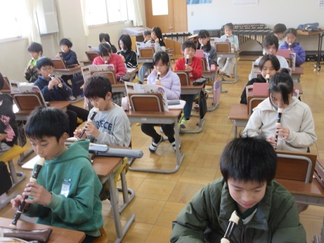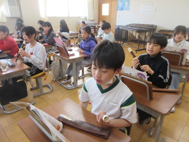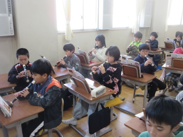 4年1組は、音楽「ごんぎつね」の学習です。歌と間奏のリコーダーを使い分けて練習しています。難しそうですが、みんな、真剣に練習しています。