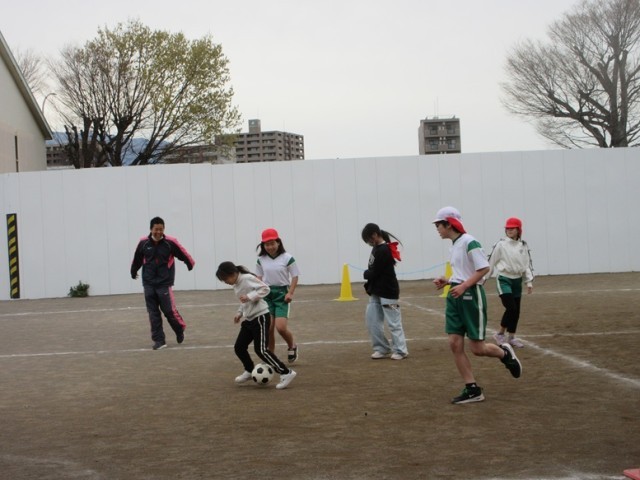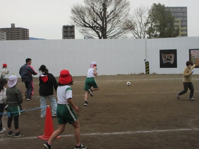 7の1組は、外で体育「サッカー」をしています。寒さを吹き飛ばすくらい、みんな、ボールを追いかけています。先生も一緒になってとっても楽しそうです。