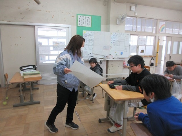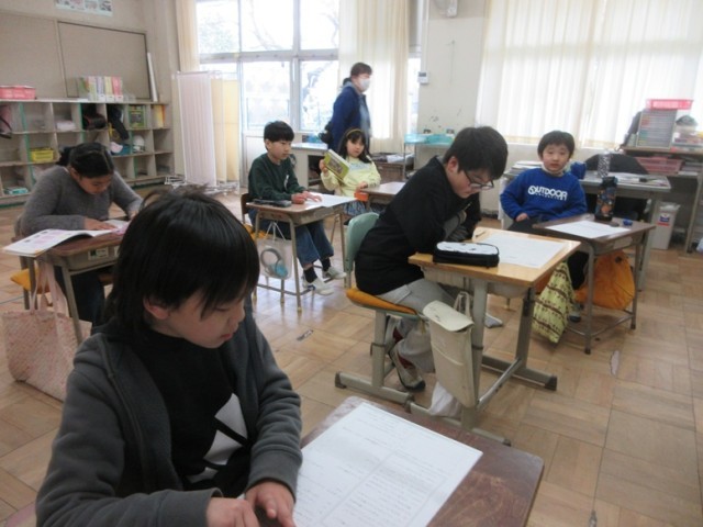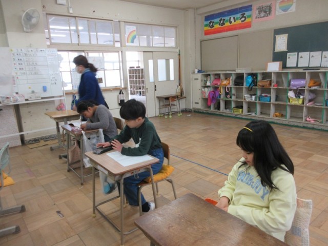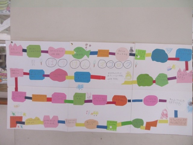 2組は、それぞれの学年に応じて国語のプリント学習です。担任の先生から「昨日作った双六が廊下に掲示してあるので見ていってください」と言われました。見るととっても楽しそうな双六ができていました。頑張りましたね!
