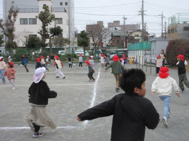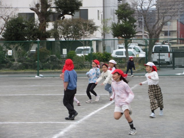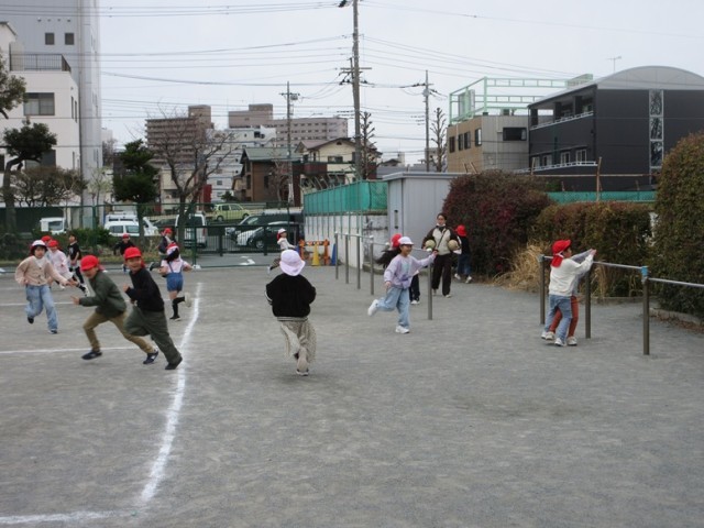 2年生は、1,2組ともお楽しみ会をしています。1組は外でけいどろをしていました。夢中で逃げたり、捕まえたりしています。