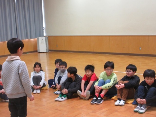 2組は多目的ホールで震源地を探せをしています。誰が震源地なのかなかなか見つかりません。自然に笑顔であふれます。