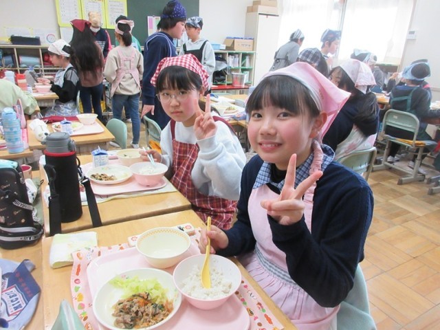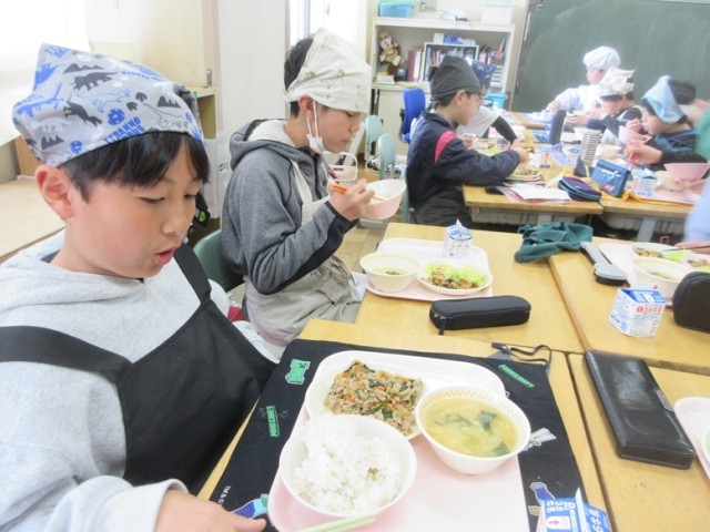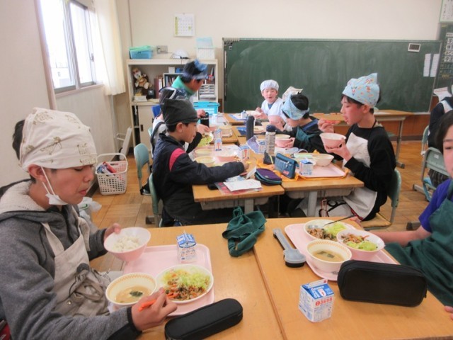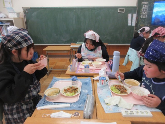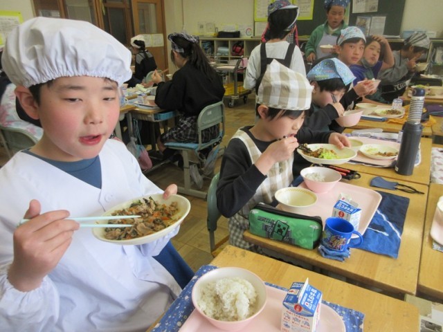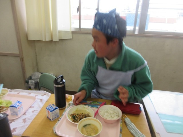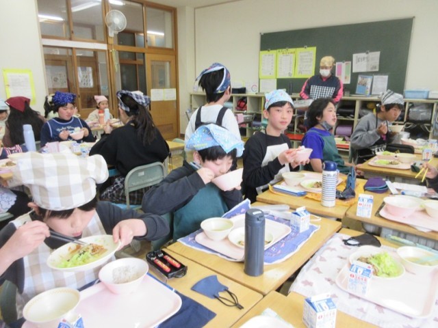 今日の献立は、麦ご飯、スタミナ焼き肉、ボイルドキャベツ、豆腐と白菜の味噌汁、牛乳です。6年生が第四小で食べる給食も今日と月曜日の2回だけとなりました。みんな、四小での給食を味わっています。