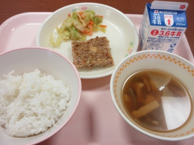 今日の献立は、ご飯、おから入り松風焼き、和風サラダ、けんちん汁、牛乳です。今日で、令和7年度の給食が終わりました。みなさんは、いろんな食材や料理にふてて、一口チャレンジで苦手を克服し、おいしく給食をいただくことができましたか?